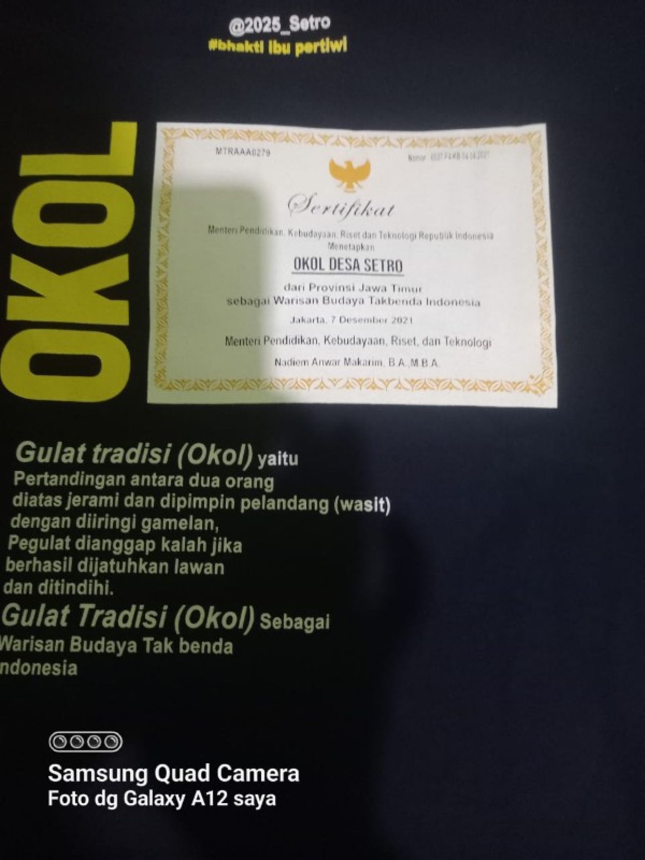 Sertipikat gulat Okol dari mendikbud. (ist)