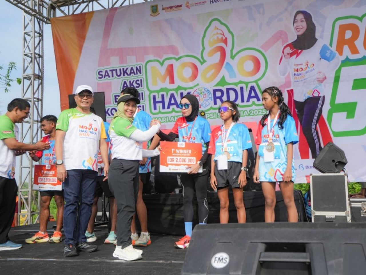 Ning Ita menyerahkan hadiah kepada para pemenang lomba Lari Hakordia 2025. (ist)